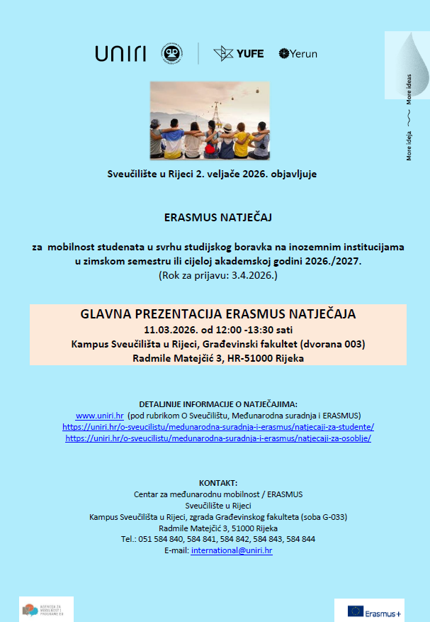 Sveučilište u Rijeci 2. veljače 2026. raspisuje Erasmus Natječaj za mobilnost studenata u svrhu studijskog boravka u zimskom semestru ili cijeloj akademskoj godini 2026./2027. u okviru programa Erasmus.